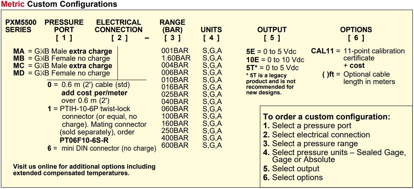 | PXM5500M[*]0-010BARG[**] | PXM5500M[*]1-010BARG[**] | PXM5500M[*]6-010BARG[**] | 0 to 10 bar | 0 to 145 psi |