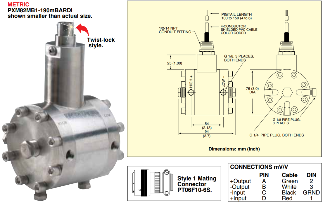 PXM82MD1-001BARDV,1 bar差压传感器,带1.5 mV/V输出和扭锁连接器。PT06F10-6S,配套连接器(单独出售)。