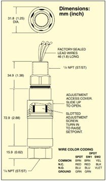 1/4FNPT 316 SS压力连接和隔膜,FKM O型圈,1/8“孔口,单个5 A SPDT开关 |