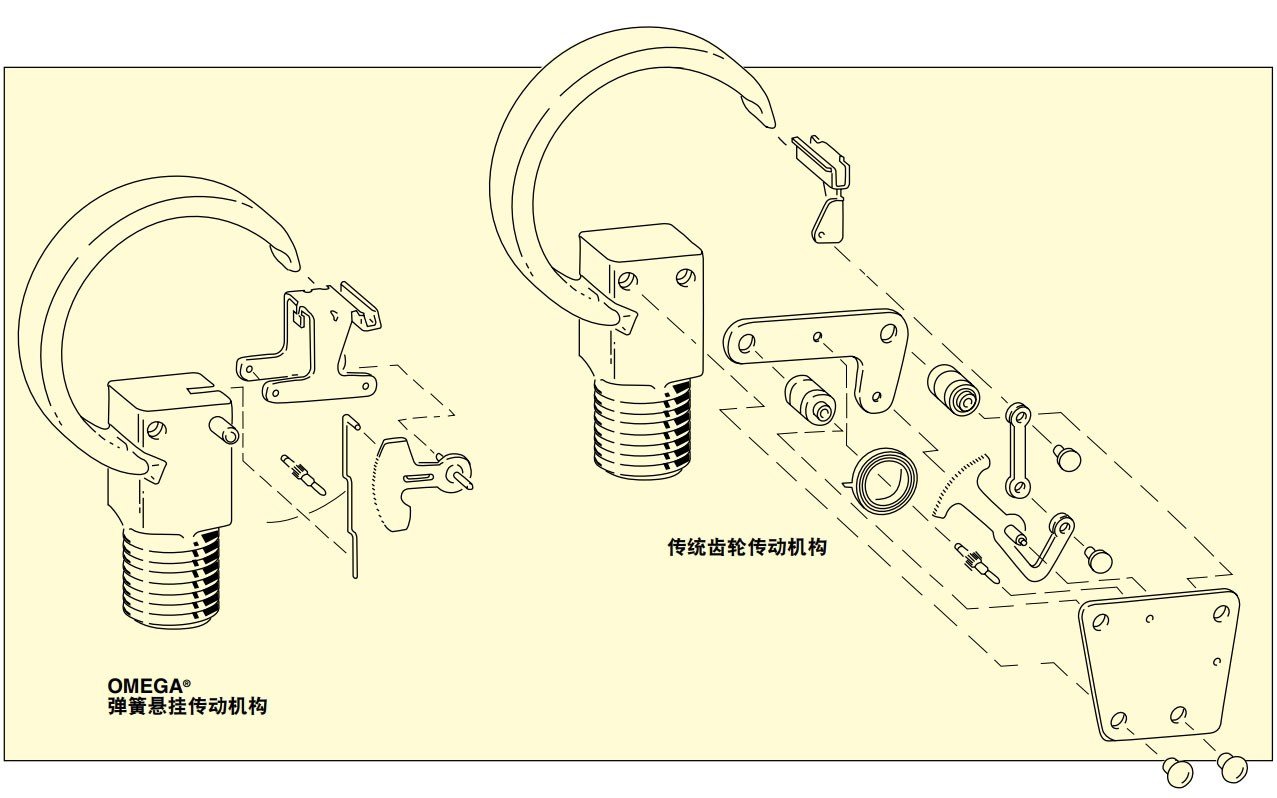OMEGA商用压力表产品线的高可靠性主要归功于独有的OMEGA弹簧悬挂传动机构。整个传动机构悬挂在2根弹簧(上方的波登管和下方的连杆)之间。磨损部件减为很少。传动机构部件通过超声波进行清洁,并通过硅油进行润滑,从而确保长使用寿命。OMEGA弹簧悬挂传动机构对冲击、颤动和振动耐受性优良。因此能够提供更长的使用寿命。