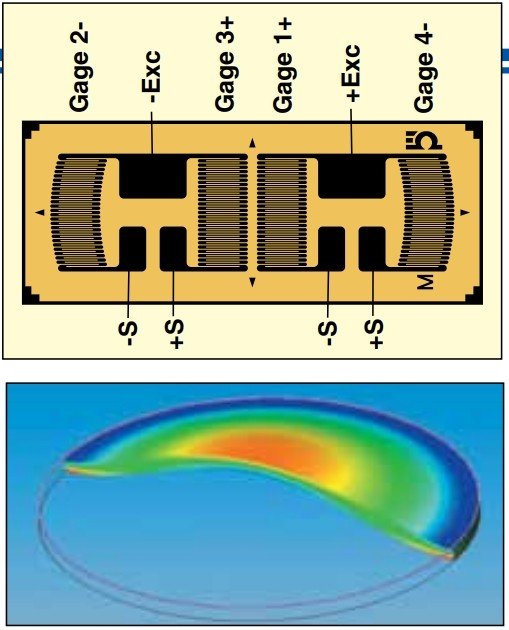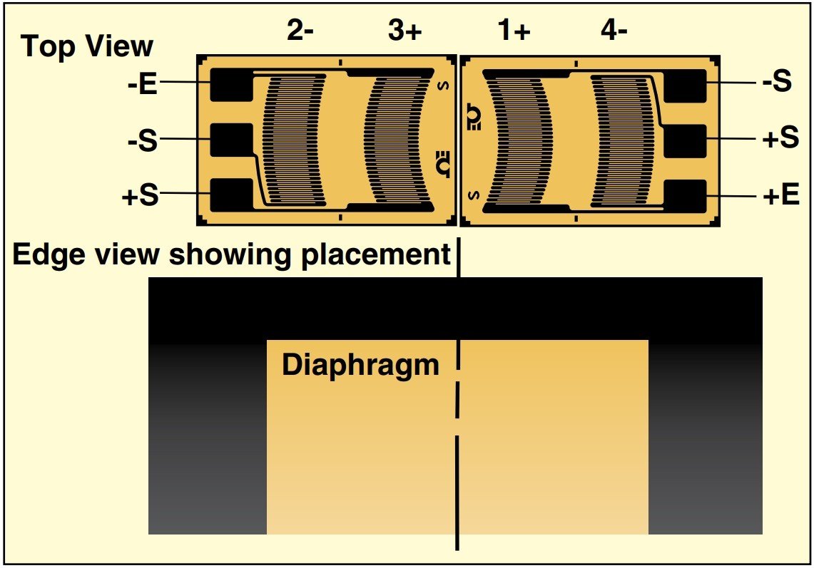 当粘接面积大于膜片直径时,可以使用以下类型的线性膜片应变片。例如,如果一个物体有一个直径为1英寸的平坦表面,应变计要粘合在该表面,但一个直径为0.5英寸的孔穿过物体,只留下一层薄薄的材料,那么这个直径为0.5英寸的薄孔就是隔膜。因此,应变计网格位于薄的高应力区域上方,引线/焊盘位于低应力区域的实体固体部分上方。这种线性膜片模式有2个应变片安装在单个载体上。