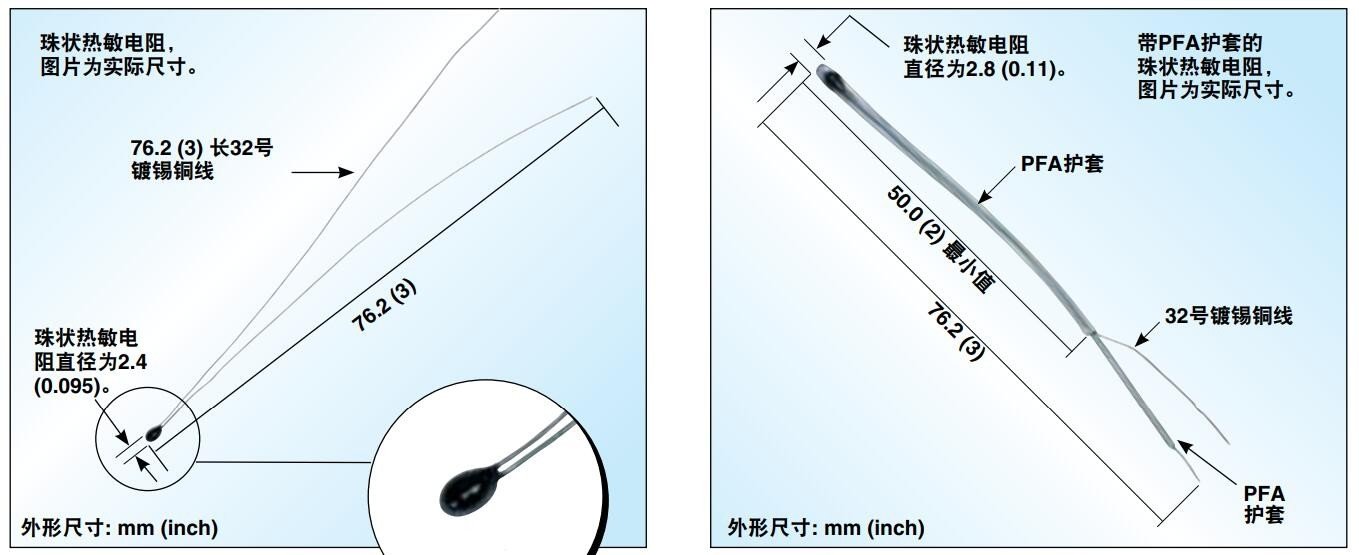 注:热敏电阻元件在供货时有一条导线覆有PFA护套,同时整体也覆有PFA护套;因此对于±0.2°C的热敏电阻和±0.1°C的热敏电阻,请将型号中间的数字改为“1”(需付额外费用)。