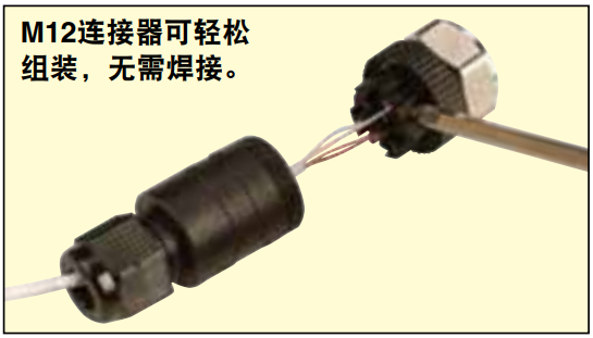 M12连接器可通过螺旋式连接,在现场连接到具有18~24号AWG导线和4~6mm(0.16~0.24")直径的现有传感器或延长电缆上。M8连接器可焊接到具有24号AWG导线和4~6mm(0.16~0.24")直径的电缆上。公母连接器具有直型或直角接头款,可提供广泛的连接选择。